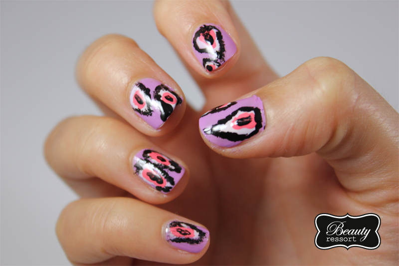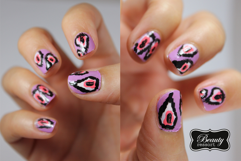 Und so gehts: eine Schicht lila Lack aus der Manhattan&Bufallo Collection auf den ganzen Nagel, dann ein paar Tupfer Essie’s Fiji ungleichmäßig auf die Nägel geben. In die Mitte der Fiji Tupfer kommt ein Klecks Trout Pout von Butter London, dann die Tupfer mit einem schwarzen Lack – in meinem Fall von Manhattan – grob umranden (noch präziser klappt es mit Nailart-Lacken) und das ganze mit einem Topcoat versiegeln. Fertig sind die Ikat Nails!