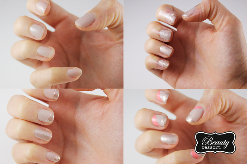Die Schritte waren ziemlich simpel: den kompletten Nagel in beige lackieren, trocknen lassen. Tesa schräg aufkleben, obere Hälfte in gold lackieren, trocknen lassen. Tesa, in die andere Richtung schräg auf den Nagel kleben und die untere Hälfte in pink lackieren, trocknen lassen. Zum Schluss noch alles mit einem Topcoat versiegeln.