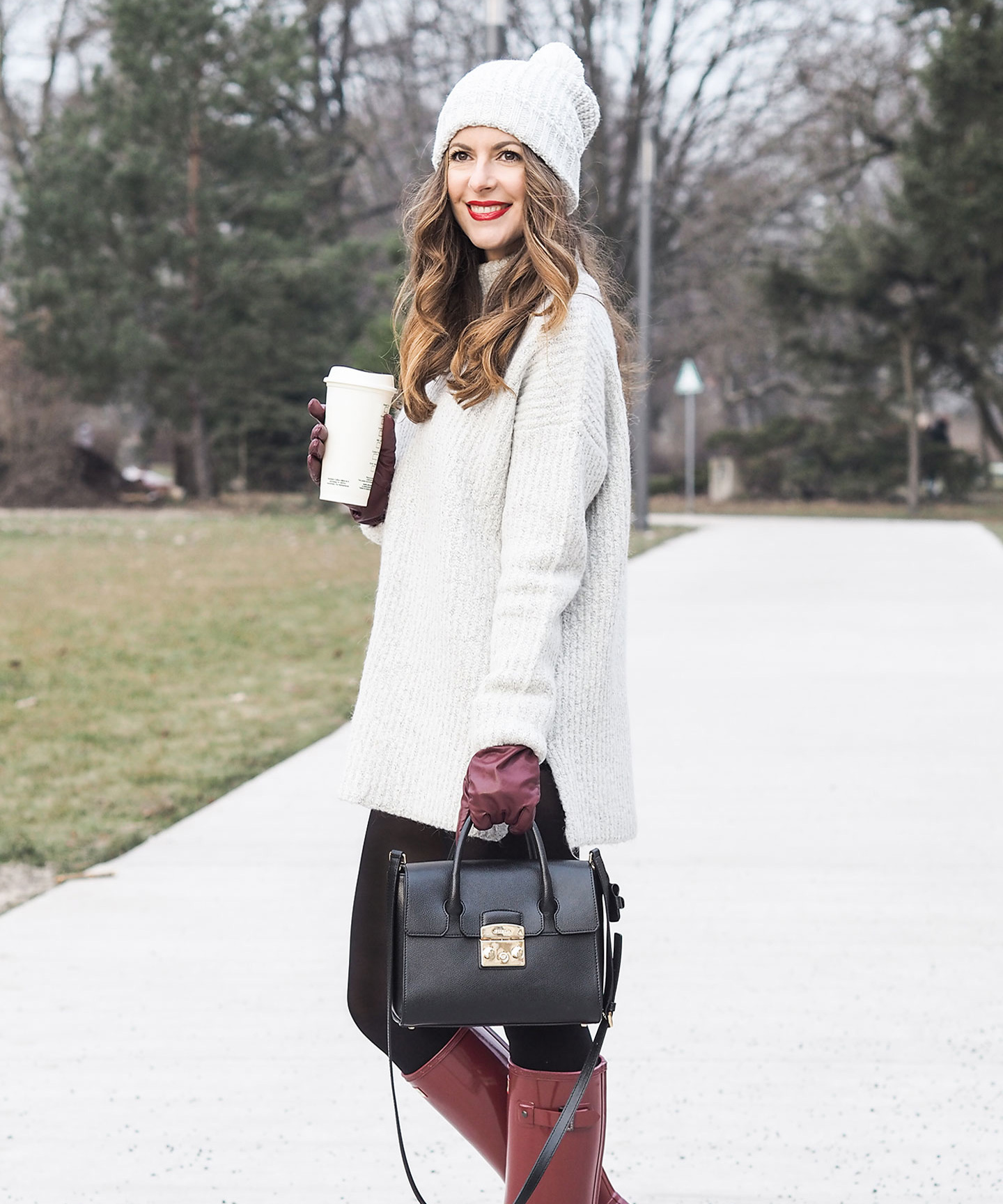 outfit-hunter-boots-rot-oversize-sweater-grau-6